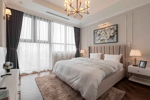 Phòng ngủ tại dinh thự trên không Diamond Residence được thiết kế ấm cúng, sang trọng. Chủ đầu tư vẫn đảm bảo tiêu chí đưa ánh sáng tự nhiên đến mọi không gian trong căn hộ, mang đến cảm giác thư thái, nghỉ dưỡng. Ngay khi thức dậy vào mỗi buổi sáng, chỉ cần kéo rèm cửa là chủ nhân đã có thể tận hưởng trọn vẹn những tia nắng đầu tiên của một ngày mới.