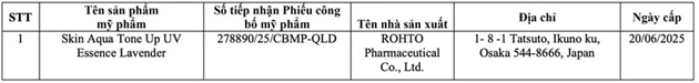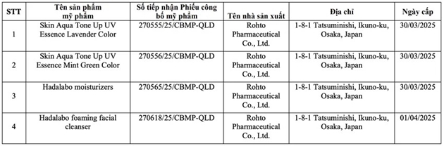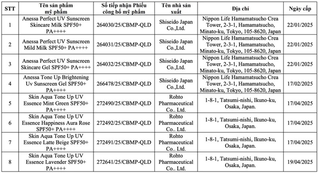 Được biết, các sản phẩm trên đều được sản xuất bởi các thương hiệu lớn của Nhật Bản là Shiseido Japan Co., Ltd. và Rohto Pharmaceutical Co., Ltd., được Cục Quản lý Dược cấp số tiếp nhận trong khoảng thời gian từ tháng 1/2025 đến tháng 4/2025.