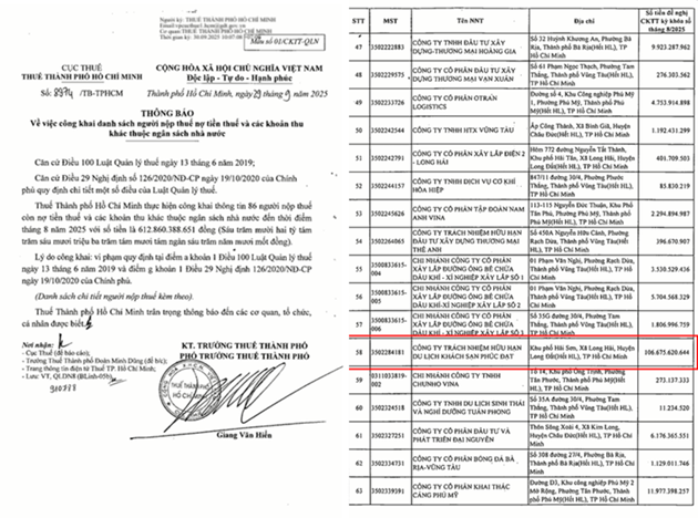 Ngày 29/9, Thuế TP.HCM đã ban hành Thông báo số 8974/TB-TP.HCM, công khai danh sách người nợ thuế và các khoản thu khác thuộc ngân sách nhà nước (sau đây gọi chung là nợ thuế).