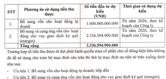 Công ty lên kế hoạch sử dụng 1.000 tỷ đồng bổ sung cho hoạt động tự doanh và hơn 2.336 tỷ đồng cho vay giao dịch ký quỹ, giải ngân tùy theo nhu cầu từ năm 2026.
