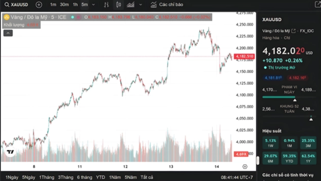 Trái ngược với đà tăng phi mã trong nước, giá vàng thế giới đang chịu áp lực điều chỉnh giảm. Cập nhật lúc 8h40 sáng, giá vàng giao ngay đang được niêm yết ở mức 4.181,50 USD/ounce, ghi nhận mức giảm 0,61% (tương đương 25,50 USD) so với phiên giao dịch trước đó.