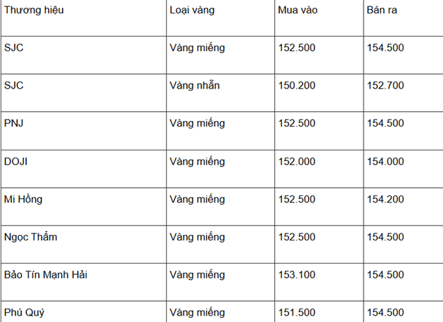 Các thương hiệu lớn như PNJ và Ngọc Thẩm cũng nhanh chóng theo sát, niêm yết mức giá bán ra 154,5 triệu đồng/lượng. Trong khi đó, Mi Hồng có giá mua vào nhỉnh hơn, đạt 152,5 triệu đồng/lượng, ngang bằng với SJC và PNJ.